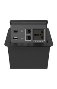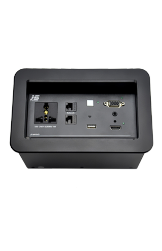 ? 某公司視頻會議項目,在設備選型中,金視JS-MF定制桌面插座)成為項目選定品牌及型號,視頻會議共使用43套金視產品;(其中21臺為銀色,19臺黑色 分1層和5層會議室使用)? 金視JS-MF定制產品?桌面電動翻轉插座,可藏式接線盒提供了一個整潔、緊湊、簡單的連接解決方案。采用電動控制,使用時只需輕按接線盒開啟按鍵,接線盒 180°旋轉,隱藏的各種接口即展現
