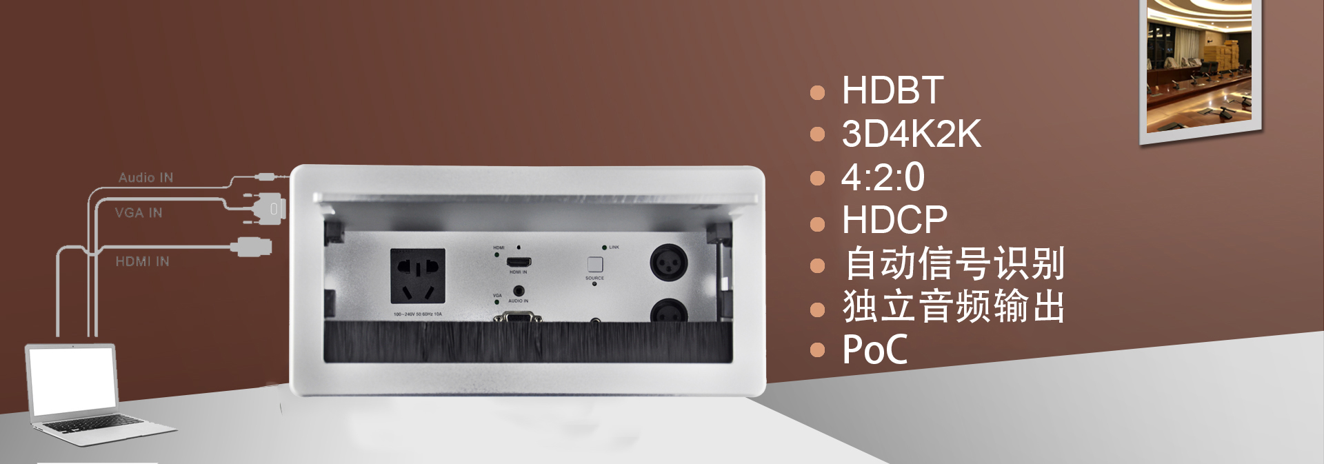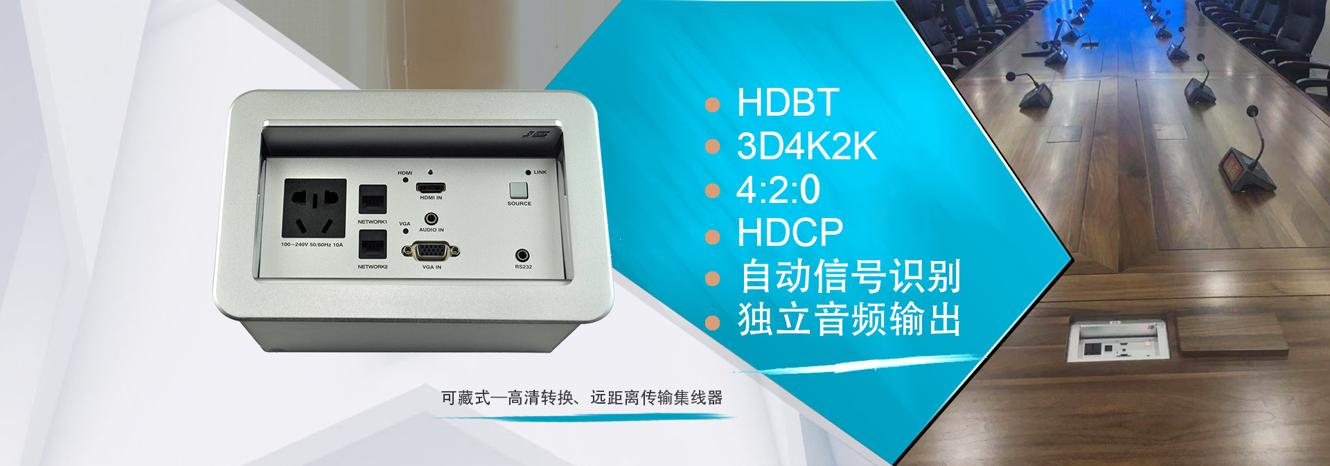 某集團董事局會議室項目順利完工,董事局會議室作為日常董事會議、遠程視頻會議功能,對于會議質量、會議安全要求極為重要,在此次的項目中共10套金視遠距離傳輸桌面型插座JS-670HD,配以遠程接收器JS-570RX,實現圖像進入矩陣進行交互式切換顯示,實現桌面4K信號進行長達70米、1080P信號100米距離傳輸,保證信號在遠距離傳輸的同時能實現4K的信號效果?